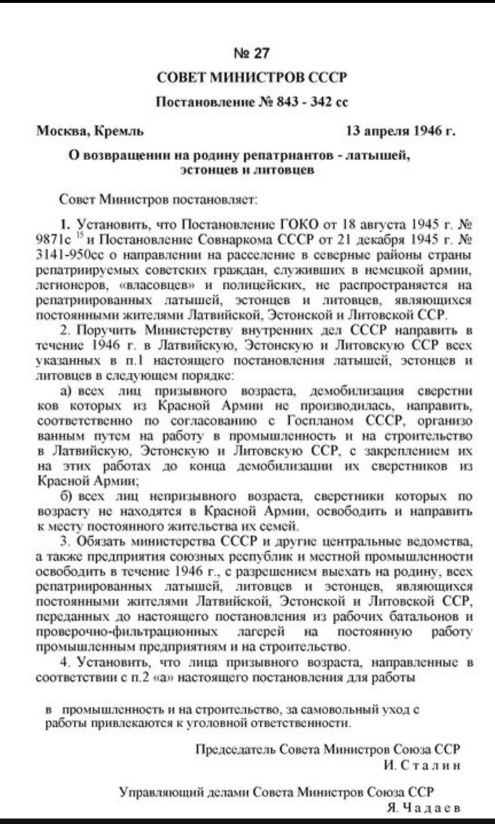 Легионеров-прибалтов амнистировали. Коллаборационисты — латыши, литовцы и эстонцы — получили от советской власти прощение без каких-либо условий,по письму Яна Калнберзина, первого секретаря Компартии Латвии (1940 — 1959 годы). Он вместе с Вилисом Лацисом — известным латышским писателем и председателем Совмина Латвийской ССР — пишет письмо на имя Вячеслава Михайловича Молотова от 16 марта 1946 года. В письме высказывается просьба пересмотреть отношение к участникам Латышского легиона СС с опорой на тезис о «принудительной мобилизации» их соотечественников в армейские структуры гитлеровской Германии. И вопрос был вскоре рассмотрен с поразительной оперативностью. Так что политика толерантного отношения к бывшим военным преступникам из республик Прибалтики началась еще до Хрущева при Сталине.