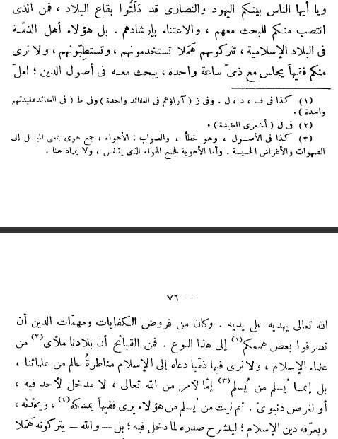 Говорит Имам ас-Субки, да помилует его Аллах: О люди! Среди вас находятся иудеи и христиане, которые заполнили уголки городов. Так кто же из вас выступил с дискуссией с ними и заботой о наставлении их на истину? Напротив, эти "ахлю-з-Зимма" (немусульмане имеющие гарантии от Мусульман) вверены вами самим себе, вы пользуетесь ими и лечитесь у них и мы не видим среди вас одного факыха (понимающего Религию) который выискивает многобожника в течение часа, проводя с ним дискуссию касаемо Основ Религии, чтобы Аллах наставил его посредством этого факыха. И направление вашей заботы в отношении представителей этого вида людей относится к коллективным обязанностям (фард кифая) и важным составляющим Религии. И из числа мерзостей присутствующих в наших городах, заполненных Учёными Ислама, что мы не видим там "зиммия" которого бы призвала к Исламу дискуссия (со стороны) одного из наших Учёных. Напротив: кто принимает Ислам, тот и принимает. Либо ввиду того, что пожелал Аллах Всевышний - и в этом нет роли никого из этих учёных, либо ввиду некой мирской цели. И затем..О если бы кто-то из этих увидел факыха, который берет его, говорит с ним и обучает его Религии Ислам, дабы раскрыть его сердце для того, что он принял. Напротив - клянусь Аллахом - они оставляют его предоставленным самому себе.
